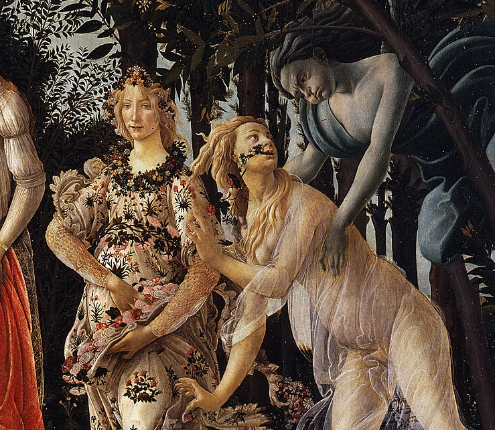 - 오른쪽 끝, 욕망과 변화의 바람: 푸른 얼굴의 서풍 신 제피로스가 님프 클로리스를 붙잡으려 합니다. 그의 입에서 나온 바람이 닿자 클로리스의 입에서는 꽃이 피어나고, 그녀는 화려한 옷을 입은 꽃의 여신 플로라로 변신합니다. 이는 메디치 가문의 통치 아래 피렌체가 거칠고 투박한 상태에서 벗어나 화려하고 풍요로운 문화의 꽃을 피웠음을 상징합니다.